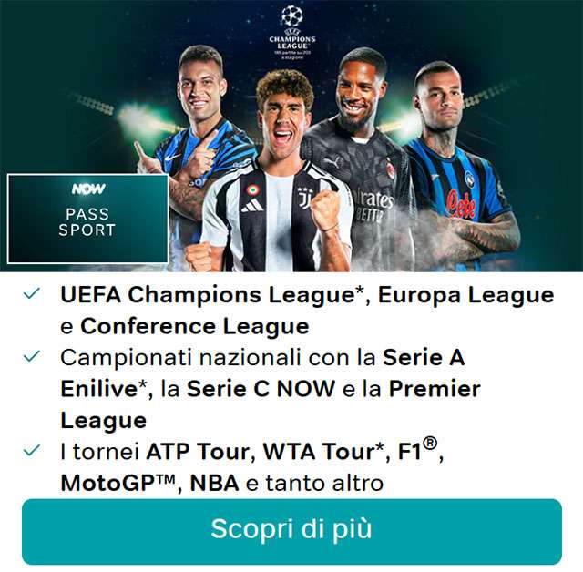Per poter guardare le partite della Champions League devi solo attivare il pass Sport di NOW: la piattaforma trasmette 185 partite su 203 in esclusiva. È disponibile da 14,99 euro al mese per i primi 12 mesi e include la Formula 1, la MotoGP e molte altre competizioni. L’accesso è garantito da tutti i dispositivi, dagli smartphone ai tablet, fino ai computer e ai televisori.