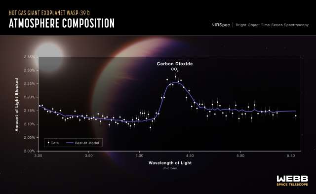 WASP-39 b ha una massa pari a circa un quarto di quella di Giove, ma un diametro 1,3 volte maggiore. A causa della vicinanza alla sua stella (circa un ottavo della distanza tra Sole e Mercurio), l’esopianeta raggiunge una temperatura di 900° C. Durante il passaggio davanti alla stella, una parte della luce viene eclissata, mentre una parte attraversa l’atmosfera. Dato che i gas assorbono differenti combinazioni di colori, i ricercatori possono analizzare lo spettro delle lunghezze d’onda della luce e determinare la composizione dell’atmosfera. Il NIRSpec del telescopio ha quindi rilevato la presenza di anidride carbonica.