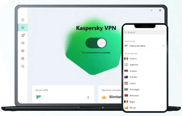 Kaspersky VPN è incluso con i prodotti di sicurezza forniti dalla stessa azienda (come, per esempio, Kaspersky Internet Security), ma è possibile sottoscrivere anche un abbonamento dedicato al costo di 5,99€ al mese, con la possibilità di connettere fino a 5 dispositivi contemporaneamente.