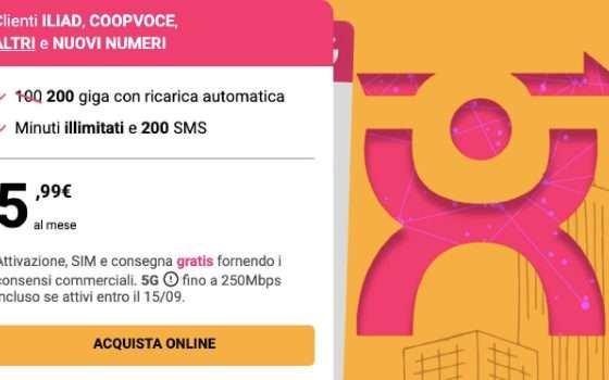 Per i clienti provenienti da Iliad, CoopVoce e Digi Mobile, Kena propone un piano da 100 o 200 GB al mese con ricarica automatica, minuti illimitati e 200 SMS al prezzo di soli 5,99 €. L’attivazione è gratuita, così come la SIM e la consegna, e i primi due mesi sono inclusi senza costi aggiuntivi. Si tratta di una delle offerte più aggressive sul mercato, disponibile solo online fino al 22 settembre.