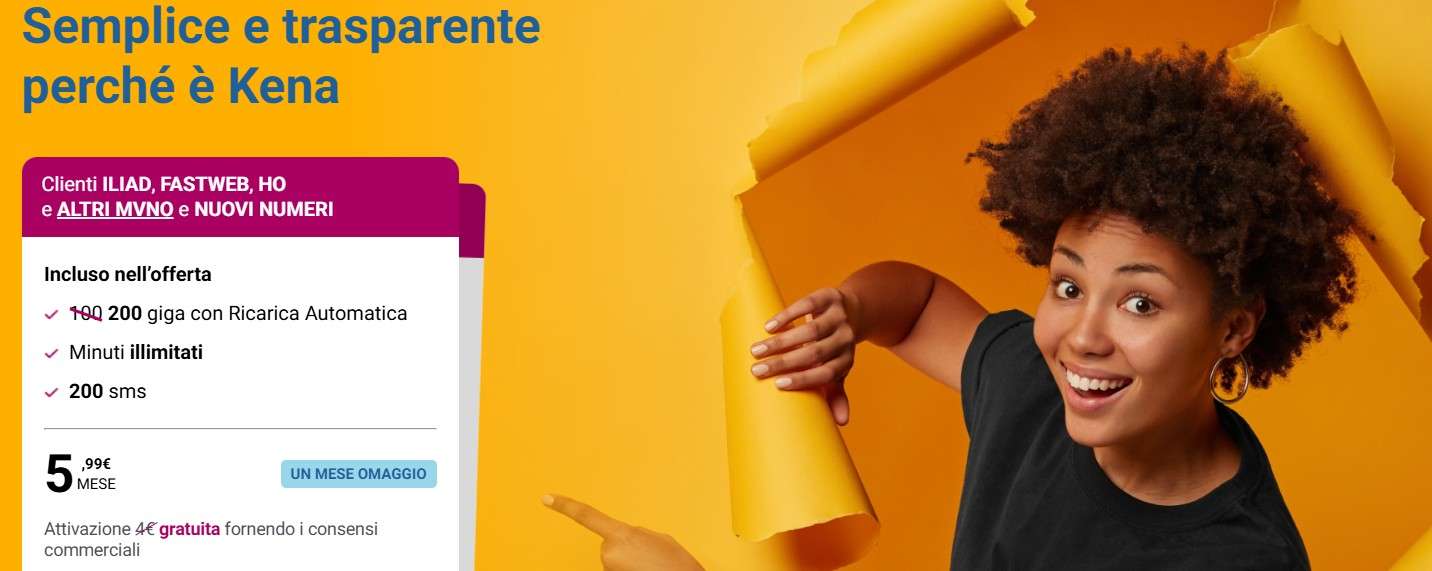 Non solo risparmi subito, ma puoi anche contare su un servizio senza vincoli nascosti. La SIM e l’attivazione sono gratuite (anziché 4€) se fornisci i consensi commerciali. E non temere: puoi cambiare idea quando vuoi, senza perdere lo sconto già ottenuto. Attivare la promo Kena è facilissimo: puoi farlo online da casa con SPID o video selfie, oppure in tabaccheria o con un corriere direttamente a casa tua. L’offerta è riservata ai nuovi clienti o a chi passa da operatori come Iliad, Ho, Poste Mobile e tanti altri. Con Kena Mobile, finalmente puoi goderti internet e chiamate senza preoccupazioni. Rispetto alle tariffe di altri operatori, Kena Mobile offre davvero un ottimo rapporto qualità-prezzo: 200GB e minuti illimitati a soli 5,99€ sono una rarità! È la scelta ideale per chi vuole spendere poco e avere tanto, senza compromessi. Scegli la tua offerta e inizia a navigare in tutta libertà!