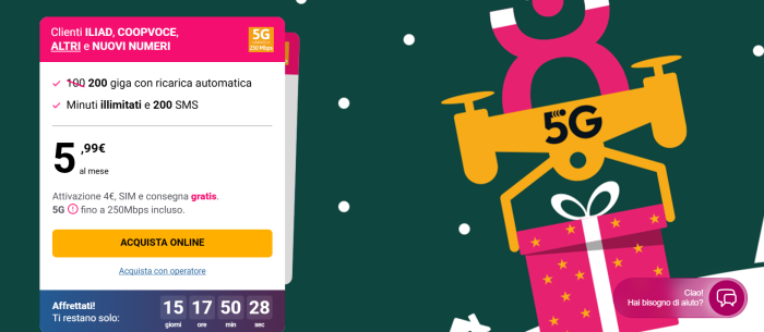 La promozione prevede 200 GB di traffico dati in 5G sulla rete TIM, accompagnati da minuti illimitati verso tutti e 200 SMS, il tutto a 5,99€ al mese. L’offerta è accessibile sia a chi richiede la portabilità da operatori come Iliad, CoopVoce, ho. Mobile, PosteMobile, Lyca, Fastweb, 1 Mobile e altri MVNO, sia a chi sceglie di attivare un nuovo numero.