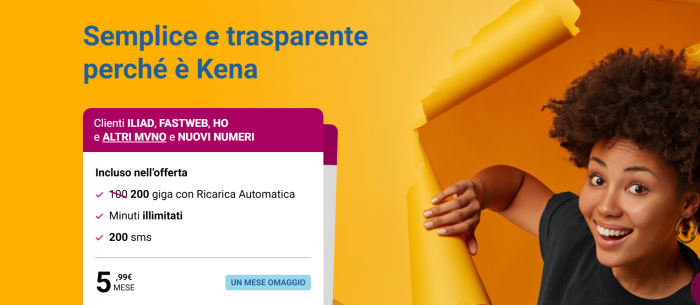 Kena Mobile propone un’offerta da non perdere per chi cerca tanti giga a un prezzo contenuto: 5,99€ al mese per 200 Giga, minuti illimitati e 200 SMS.