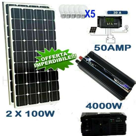 Il momento è perfetto per sperimentare il montaggio fai da te di una mini centrale elettrica sul balcone o in giardino. Questo kit per il fotovoltaico arriva a 2KW al giorno in piena estate e un 1KW minimo garantito in inverno. In dotazione hai ben 2 pannelli solari da 100W in totale, un regolatore di carica da 50A e persino un inverter per la corrente alternata che arriva fino a 4000W.