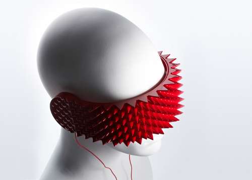 Il designer Joe Doucet , che sarà in mostra all’evento milanese Meet My Project dal 17 al 21 Aprile, presso lo Studio Next di Viale Crispi, 5, spiega che la scelta del colore rosso e delle strutture appuntite nella zona anteriore di queste cuffie, a chiusura degli occhi, non è casuale. Vuole simboleggiare la difesa di se stessi e del proprio diritto alla quiete, ammonendo il mondo estero a non superare il confine che si è posto attorno alla propria intimità.