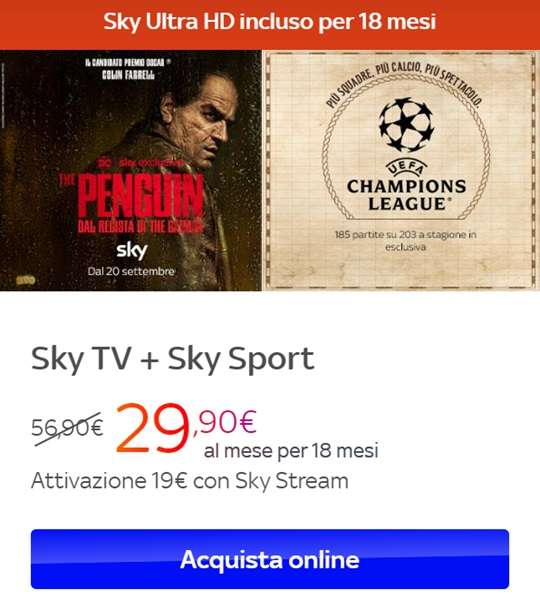La promozione Sky TV + Sky Sport a soli 29,90 euro al mese per 18 mesi invece di 56,90 euro è attivabile online tramite questa pagina del sito Sky.