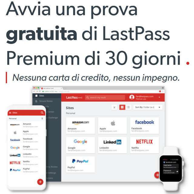 Ricapitolando, puoi iniziare subito la prova gratuita di 30 giorni con accesso completo a tutte le funzionalità di LastPass Premium, così da mettere alla prova le caratteristiche di questa soluzione avanzata per la gestione degli account e delle credenziali. Non ci sono obblighi di rinnovo: al termine del periodo potrai comunque passare alla formula Free che non prevede alcuna spesa.