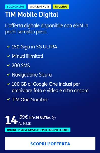 Tra le offerte mobile dell’operatore telefonico TIM occupa una posizione di rilievo TIM Mobile Digital, l’offerta con eSIM attivabile esclusivamente online con 150 Giga in 5G Ultra, minuti illimitati e 200 SMS. Inoltre, include anche le opzioni Navigazione Sicura e TIM One Number, più 100 GB di Google One per archiviare in uno spazio cloud offerto da Google foto, video e altro ancora.