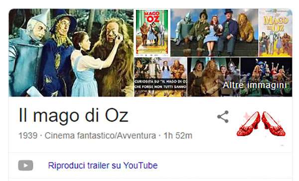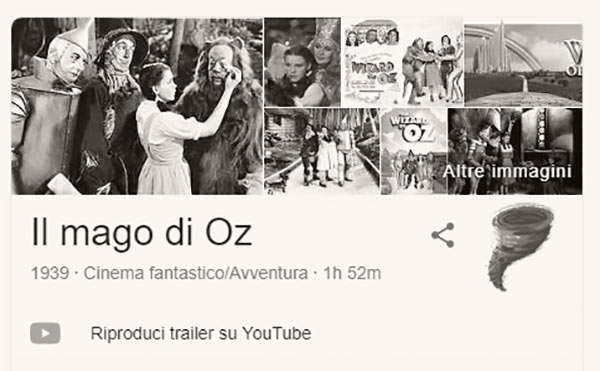 Il gruppo di Mountain View ha incluso nel motore di ricerca un easter egg: è sufficiente digitare “Il Mago di Oz” per veder comparire all’interno del Knowledge Panel un paio di scarpette rosse, come quelle del film. Una GIF dal sapore rétro: basta un click per battere i tacchi tre volte, con la pagina dei risultati che inizierà poi a girare su se stessa, proprio come quando Dorothy torna a casa (“There’s no place like home”) alla fine della sua avventura.