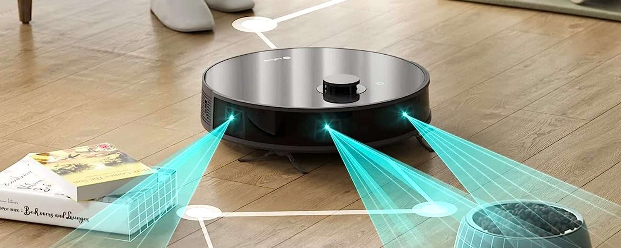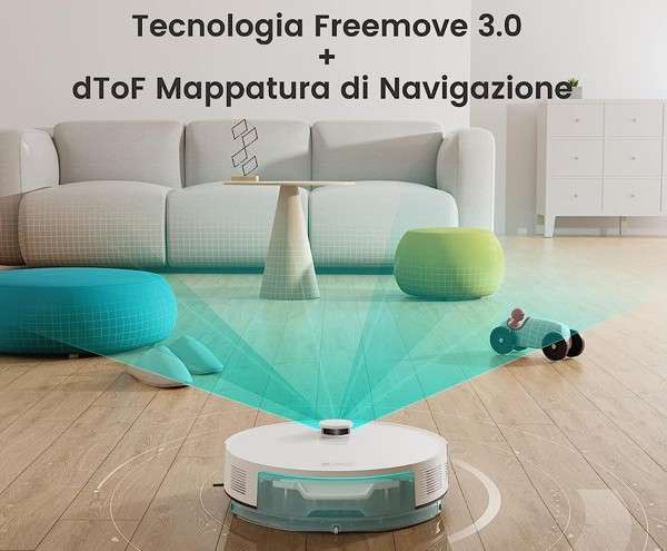 Il robot utilizza una mappatura DToF Lidar che genera le mappe iniziali in modo completo e rapido: è questa la lavagna sulla quale poi il robot andrà a scrivere giorno dopo giorno i propri cicli di pulizia, disegnando ogni giorno il miglior tragitto in base agli elementi contestuali raccolti sul tracciato.