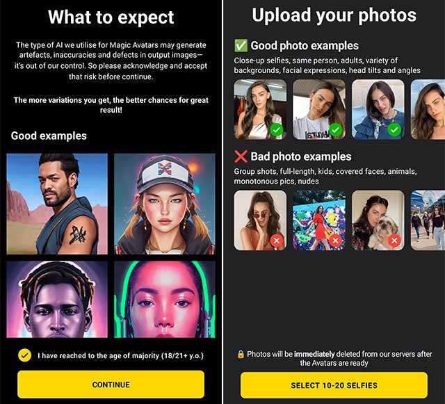 Quel che più sta attirando l’attenzione è però la nuova Magic Avatar, disponibile da novembre. Come anticipato in apertura, genera un personaggio digitale con le fattezze dell’utente, impiegando un’IA. Per farlo è necessario caricare almeno 10 selfie (fino a un massimo di 20) catturati da vicino e di buona qualità. Sono forniti alcuni esempi utili a capire quali risultano adatti e quali invece no.