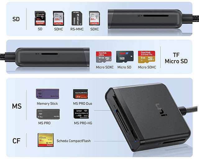 Si basa sullo standard USB 3.0 per assicurare una velocità elevata nei trasferimenti ed è compatibile con tutti i sistemi operativi, integra 4 porte che all’occorrenza possono anche funzionare in contemporanea, leggendo e scrivendo dati simultaneamente su altrettanti supporti. Eccole, con tutti i formati supportati. Ha in dotazione un cavo in nylon intrecciato dalla lunghezza pari a 60 centimetri, resistente e comodo anche per essere trasportato nella borsa o nello zaino. Per saperne di più, dai uno sguardo alla scheda completa.