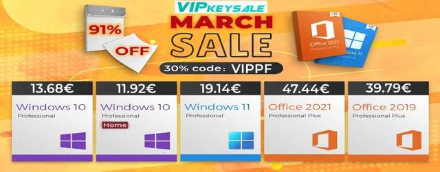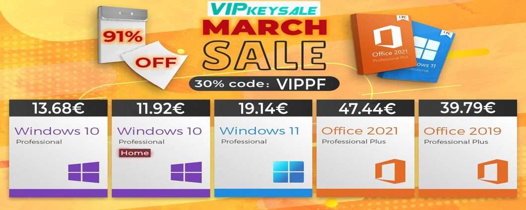 Marzo fa scendere la scure sui prezzi delle licenze software di VIPKeySale: si arriva addirittura al 91% sulle migliori offerte. Avere una licenza originale a vita per Windows e Office diventa questione di appena pochi euro: è sufficiente scegliere il software desiderato e, in fase di acquisto, applicare il coupon esclusivo VIPPF per poter accedere al massimo dello sconto. Quelle che seguono sono tutte le istruzioni per dare vita nuova alla tua postazione di studio, di gioco o di lavoro.