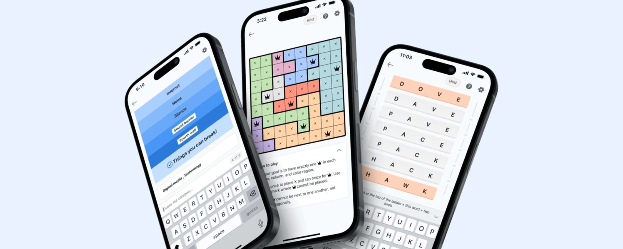 Pinpoint è un “word association game”. L’utente deve indovinare la categoria in comune tra cinque parole mostrate una alla volta. Il punteggio più alto viene assegnato con meno parole visualizzate. Queens è un gioco di logica. Nel minor tempo possibile deve essere posizionata una corona in ogni riga, colonna o regione colorata, evitando che due corone siano vicine.