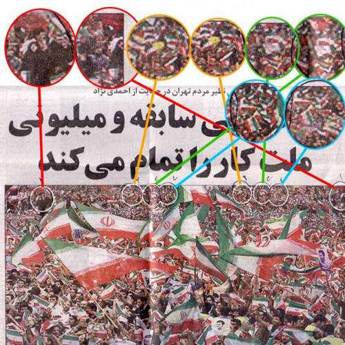 Sebbene si trattasse di un gruppo di cittadini ben nutrito, i consiglieri per la comunicazione, o chi per loro, hanno optato per la modifica di alcune fotografie che ritraevano manifestanti in favore dell’ex sindaco di Teheran, per far apparire la partecipazione molto più corposa di quanto fosse.