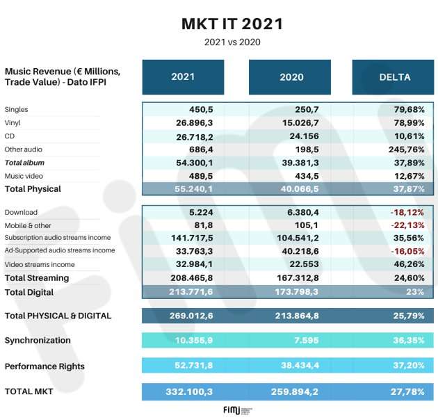 #DatiMusica 🇮🇹 • È boom della musica registrata nel 2021! Il mercato musicale italiano cresce del 27.8% superando i €332 milioni di ricavi: il settore è trainato dallo streaming in abbonamento, che segna un aumento del 35.6%. pic.twitter.com/O2R5PMYmKq