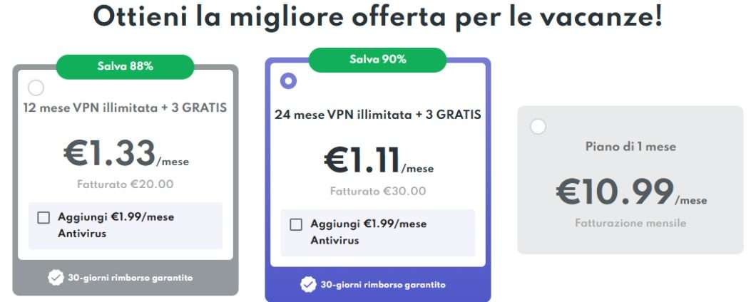 L’offerta estiva di PrivadoVPN è un’occasione perfetta per garantirti protezione e libertà online non soltanto durante le vacanze, ma anche – e soprattutto – a lungo termine. Con solo 1,11 euro al mese, metti al sicuro la tua privacy senza pensieri: approfitta subito del 90% di sconto a tempo limitato!