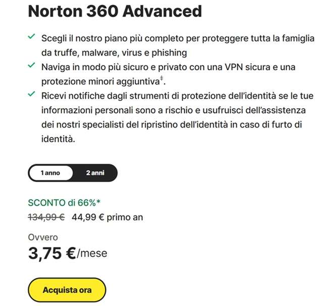 L’offerta in corso sul sito di Norton, grazie alla quale è possibile risparmiare il 66% sul piano Advanced di Norton 360, è valida per un periodo di tempo limitato.