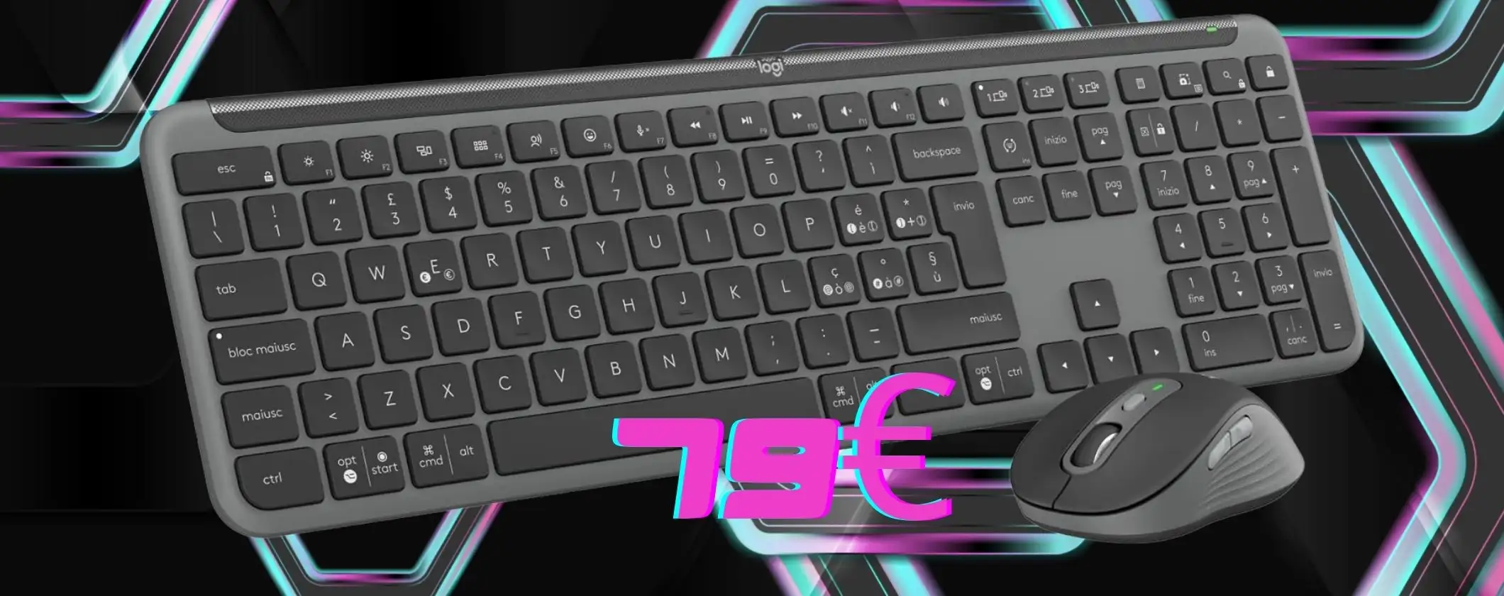 Con il kit Logitech MK950 Signature Slim wireless potrai avere una tastiera e un mouse davvero eccezionali a un prezzo ridicolo. La tastiera Logitech Signature Slim K950 è dotata di tasti silenziosi e leggermente concavi per una digitazione velocissima. Ha un layout completo con tastierino numerico e tasti Easy Switch per passare da un dispositivo all’altro. Ha una retroilluminazione intelligente e una batteria che si ricarica con il cavo USB.