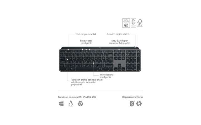 Logitech MX Keys è una tastiera perfettamente integrata con il desiderio degli utenti che cercano una digitazione comoda e veloce. La conformazione dei tasti, più larghi di una tastiera meccanica e con una forma leggermente convessa, garantiscono una maggiore precisione risultando così più rapida e con meno errori di battitura. La retroilluminazione intelligente si regola in base alla luce ambientale. Realizzata in plastica riciclata e con batteria intelligente, promuove un futuro migliore.