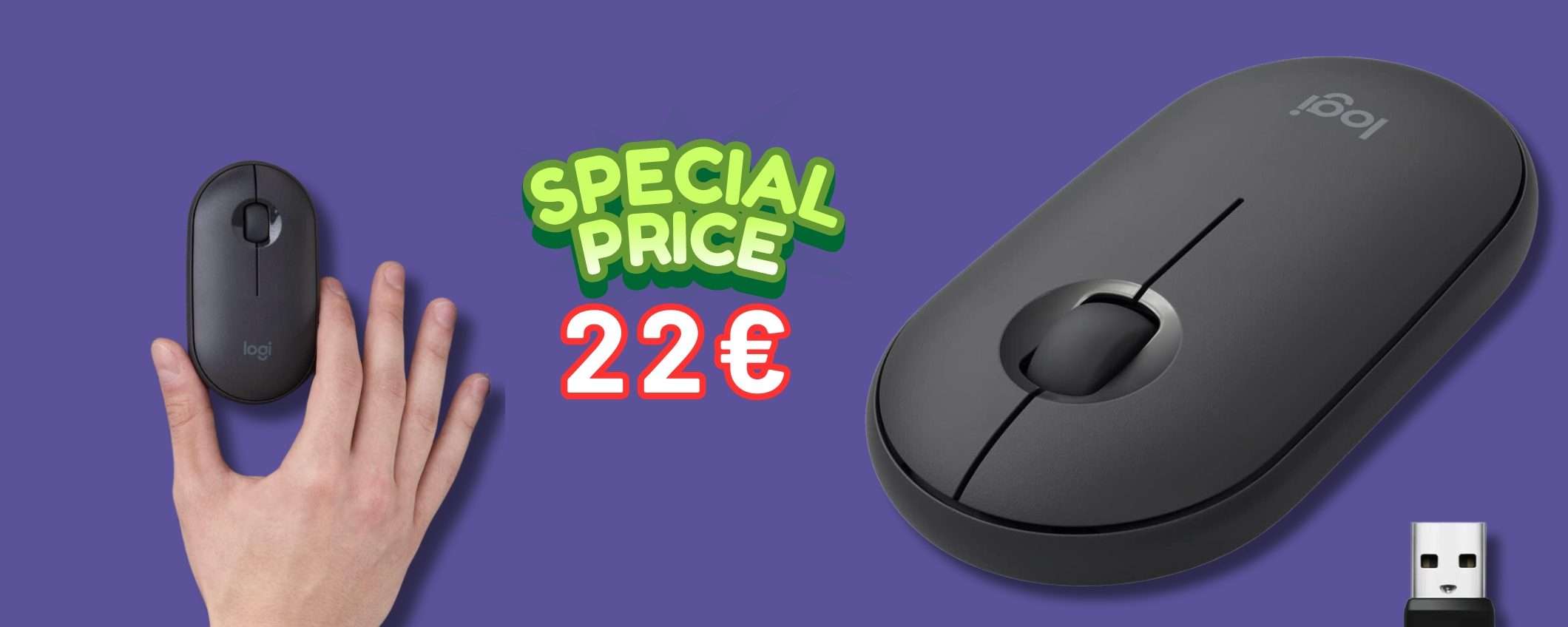 Piccoletto ma senza compromessi. Logitech Pebble è il mouse wireless da abbinare a qualunque dispositivo potendolo connettere sia via Bluetooth che con micro ricevitore USB. Comodo e pratico grazie ai tre classici tasti e alla sua silenziosità suprema. Su Amazon è in sconto, con un ribasso del 24% lo fai diventare tuo ad appena 22,90 euro. Collegati a compralo ora.