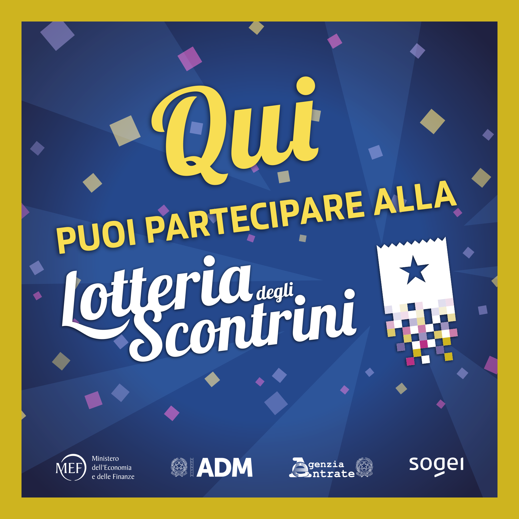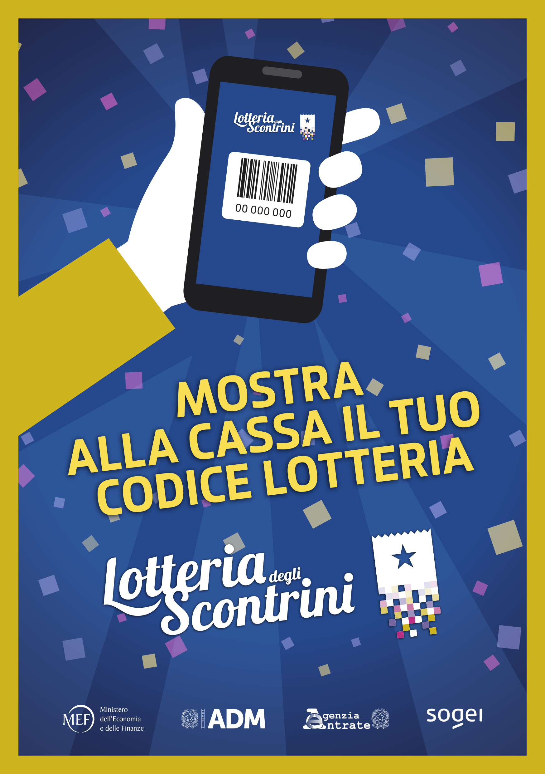Gli esercenti che desiderano comunicare ai clienti la loro adesione alla Lotteria degli Scontrini possono farlo esponendo in negozio o nel punto vendita una delle grafiche ufficiali dell’iniziativa. Per farlo è sufficiente scaricarle, stamparle e posizionarle dove meglio si crede: sulla porta, in vetrina o vicino alla cassa.