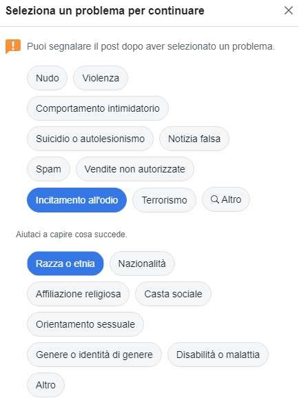 Un post su Instagram si può ad esempio segnalare etichettandolo come “incitazione all’odio”. Spiega il social network che è pronto a rimuovere: