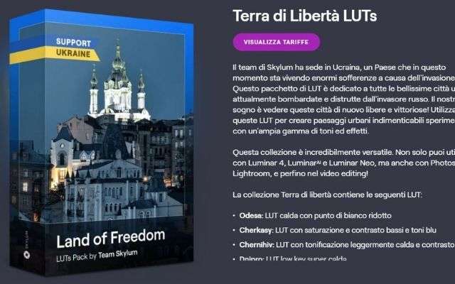 Luminar lancia il pacchetto di LUT “Terra di Libertà“. Sviluppato dal team di Skylum, con sede in Ucraina, questo pack è dedicato a tutte le città ucraine attualmente bombardate nel conflitto contro la Russia. In una iniziativa volta a sensibilizzare sulla questione ucraina, puoi utilizzare queste LUT per creare paesaggi urbani indimenticabili grazie all’ampia gamma di toni ed effetti a disposizione.