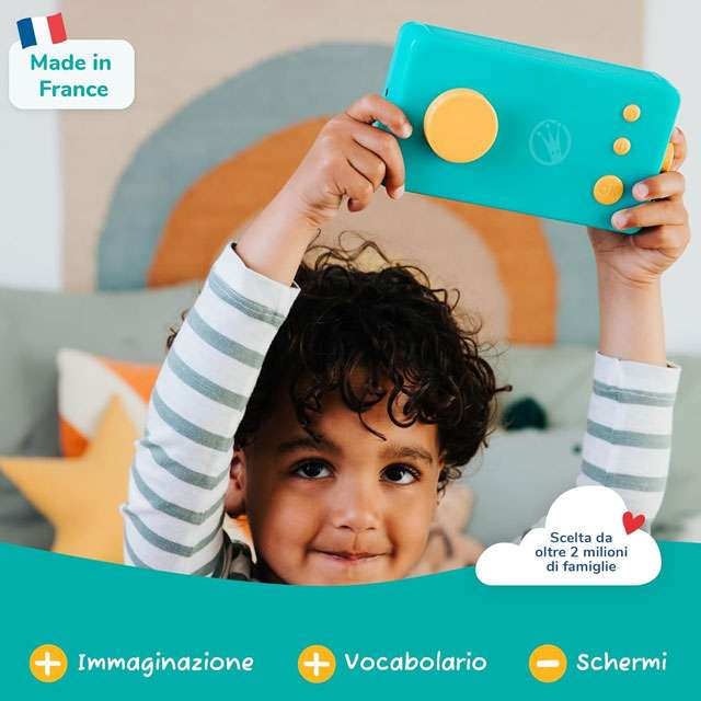 Permette di creare le proprie storie scegliendo il protagonista, un luogo, un oggetto e un altro personaggio, dando così vita ad avventure e favole sempre diverse e originali, da ascoltare in tutta sicurezza. Incluso con l’acquisto c’è il primo audiolibro con 24 storie. Per scaricarne altre non servono cavi, grazie alla connettività Wi-Fi in dotazione. La batteria interna assicura fino a 8 ore di ascolto con una ricarica e non manca nemmeno la presa jack da 3,5 mm per il collegamento delle cuffie o degli auricolari. Scopri di più nella pagina dedicata.