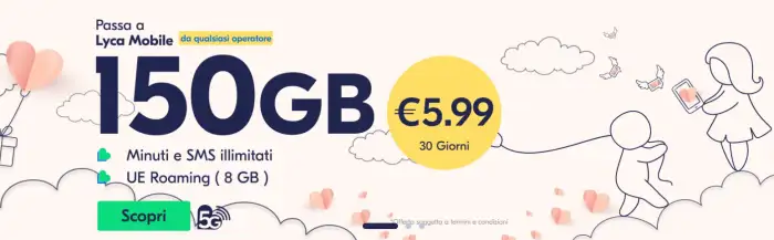 Include 150 GB in 5G su rete Vodafone, oltre a tutta una serie di altri vantaggi, al prezzo di 5,99€ al mese. E i primi due mesi sono gratis! Per attivarla basta andare sul sito di Lycamobile. Andiamo a scoprirla in tutti i suoi dettagli.
