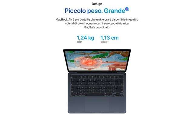 MacBook Air 2022 ti sorprenderà con un design incredibilmente sottile per un peso complessivo di soli 1,24 kg. Questo lo rende un notebook ultraversatile per lavorare, giocare, studiare e creare ovunque ti trovi.