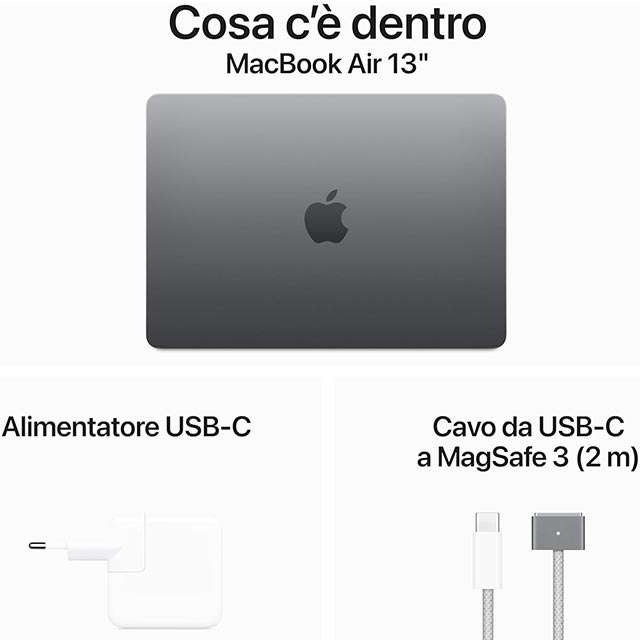 All’interno di un design come sempre senza compromessi, c’è la componente progettata dal gruppo di Cupertino per supportare gli utenti in ogni ambito, con CPU 8-core, GPU 10-core e Neural Engine 16-core per l’intelligenza artificiale. Tra gli altri punti di forza integrati citiamo la videocamera FaceTime HD 1080p e l’autonomia fino a 18 ore con una sola ricarica. Lato software, il sistema operativo preinstallato è macOS Sonoma con accesso garantito agli aggiornamenti rilasciati in futuro. Per saperne di più rimandiamo alla descrizione completa.