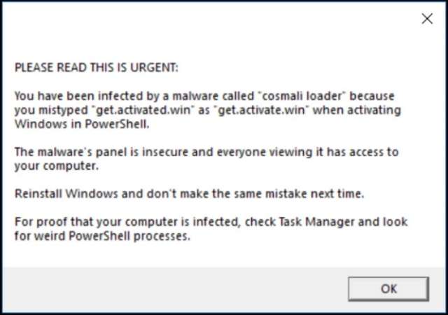 Non è chiaro chi ha inviato il messaggio. Probabilmente un ricercatore di sicurezza ha ottenuto l’accesso al pannello di controllo del malware e informato le vittime, consigliando di reinstallare Windows. Gli sviluppatori di MAS hanno confermato la campagna di typosquatting.