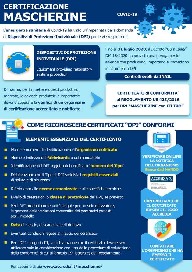 Una prima importante informazione in tal senso è fornita da Accredia, “Ente italiano di accreditamento”, che riassume le informazioni necessarie affinché un prodotto possa essere verificato. Secondo quanto spiegato, qualora un DPI sia stato vagliato da un organismo notificato, deve riportare: