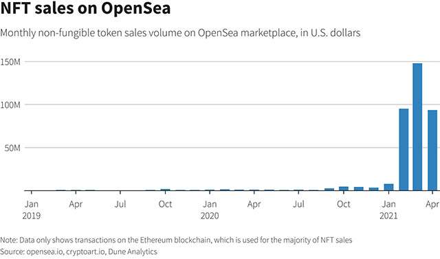 Si è passati da pochi milioni di dollari in gennaio a sfiorare quota 100 milioni in febbraio, spingendosi poi alla soglia dei 150 milioni in marzo, mentre aprile è tornato sui livelli di due mesi prima. La rappresentazione grafica del trend nell’immagine seguente, condivisa (come le altre in questo articolo) sulle pagine di Reuters. Sarà essenziale osservare il prossimo periodo per capire in che direzione evolverà, anche in considerazione del fatto che molti hanno deciso di puntare su un’ulteriore crescita: è il caso ad esempio dell’exchange Binance, del campione di football americano Tom Brady e di eBay.