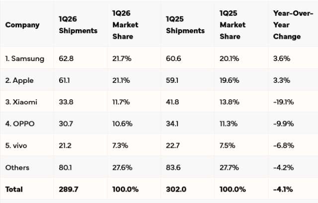 Il dato peggiore è quello registrato da Xiaomi (-19,1%) che mantiene il terzo posto. Il produttore cinese ha ridotto le spedizioni dei vecchi modelli per evitare aumenti di prezzo. Seguono OPPO (-9,9%) e vivo (-6,8%). Secondo IDC, i produttori continueranno a puntare sui modelli premium anche se i prezzi delle memorie si stabilizzeranno nella seconda metà del 2027.