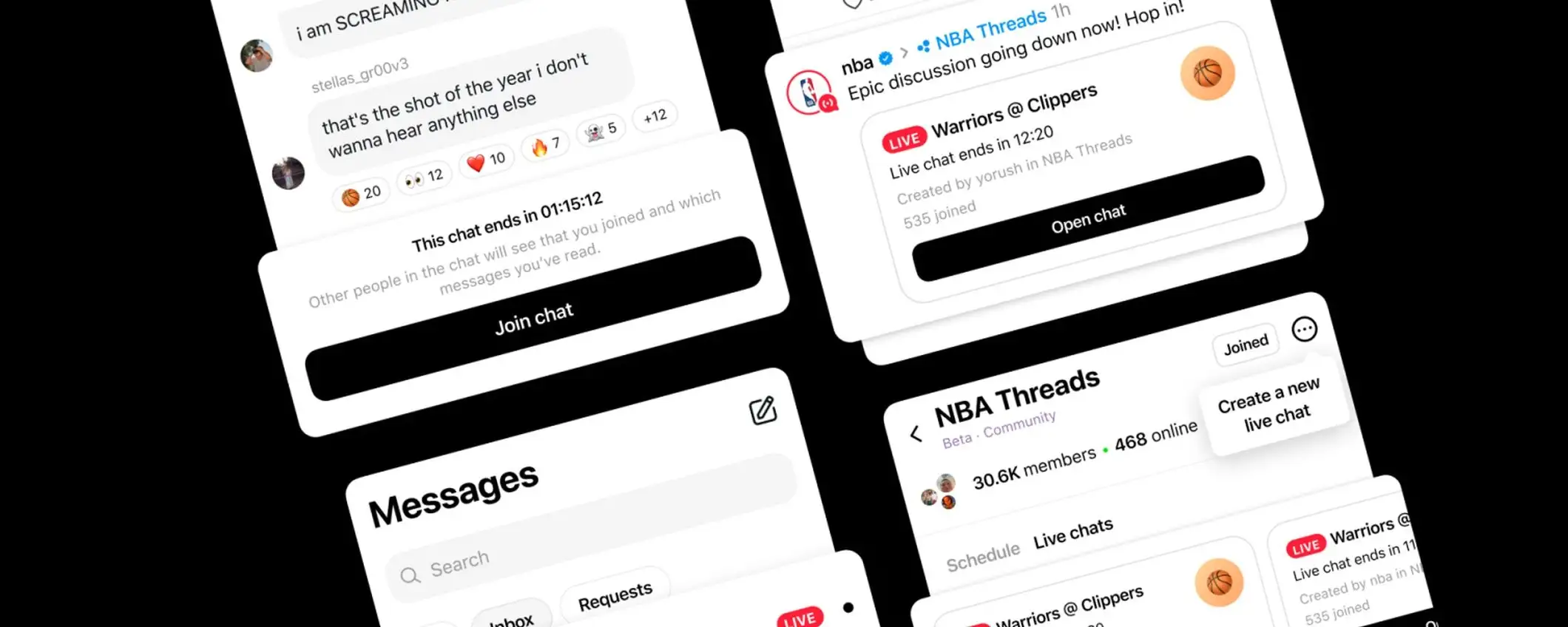 Dal mese di ottobre 2025 sono disponibili le Community in Threads. Meta ha ora annunciato le Live Chat, una funzionalità che permette di partecipare alle conversazioni in tempo reale su particolari eventi. Inizialmente sarà disponibile solo per la NBAThreads Community durante i play-off della NBA. Successivamente verrà estesa ad altre Community.
