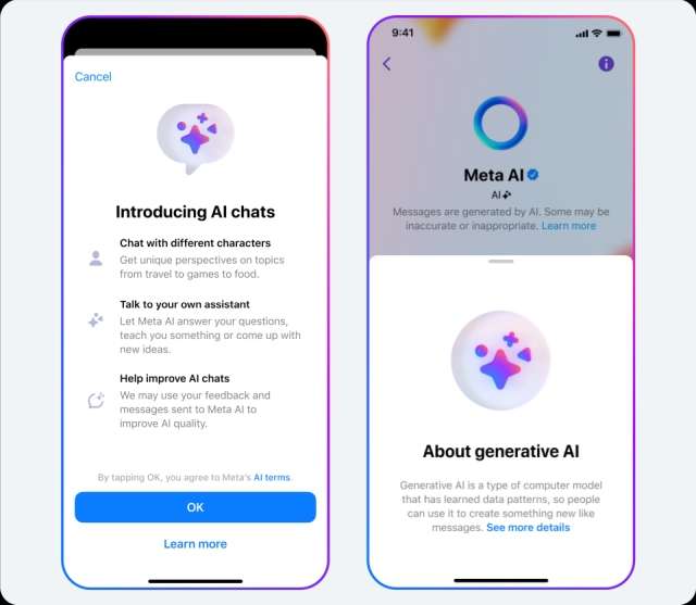 Meta ha pubblicato diversi documenti sulle funzionalità IA per una maggiore trasparenza. Le immagini avranno un watermark che indica l’uso dell’IA generativa. Verrà inoltre chiaramente specificato che gli output potrebbero essere imprecisi o inappropriati.