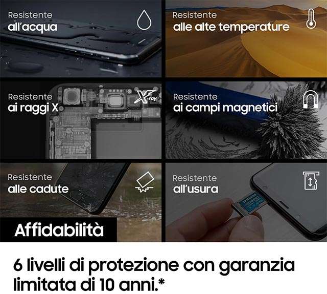 Le prestazioni sono da top di gamma assoluto, senza compromessi: velocità fino a 160 MB/s nel trasferimento dati, così da poter salvare anche i contenuti multimediali in alta definizione senza rallentamenti, ad esempio i video in formato 4K. La puoi utilizzare in smartphone, tablet, computer, lettori multimediali, fotocamere, videocamere, action cam, sistemi per la sorveglianza della casa e molto altro ancora. Come mostrato dall’immagine qui sotto, il design è progettato per resistere all’acqua, alle alte temperature, all’esposizione ai raggi X, ai campi magnetici, alle cadute e all’usura. Trovi tutte la altre informazioni che cerchi nella descrizione completa.
