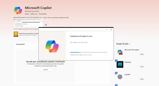 L’app Copilot ha avuto diverse forme: PWA (Progressive Web App), WebView e nativa. L’ultima versione è sicuramente la peggiore di tutte. Una delle novità si nota appena viene avviato il download dal Microsoft Store. Non viene scaricata direttamente l’app, ma solo l’installer. Si avvia automaticamente in una finestra separata e, al termine della procedura, sostituisce la precedente app nativa.