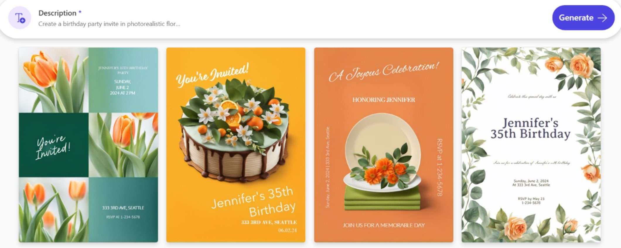 In un post sul blog Microsoft 365 Insider, l’azienda di Redmond ha dichiarato che la creazione di inviti personalizzati con Microsoft Designer AI è un processo semplice e intuitivo. L’utente deve solo fornire le informazioni essenziali riguardanti l’evento, come l’occasione, la data, l’ora e il luogo. Invitations si occuperà di generare un design verticale personalizzato, ottimizzato per la condivisione su dispositivi mobili. I dettagli dell’evento vengono sovrapposti alla grafica generata dall’AI sotto forma di testo modificabile, garantendo un risultato d’impatto e facilmente personalizzabile.