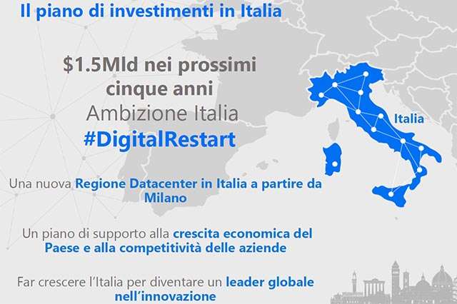 Un piano dalla durata di cinque anni con investimenti complessivi pari a 1,5 miliardi di dollari. Oggi Microsoft annuncia l’iniziativa #DigitalRestart, nell’ambito del programma Ambizione Italia lanciato nel 2018, ponendosi due chiari obiettivi: accelerare il processo di trasformazione digitale del paese e realizzare la prima Regione Data Center nel nostro territorio, situata a Milano.