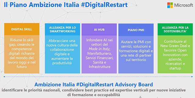 In prospettiva anche la creazione di un Advisory Board per Ambizione Italia #DigitalRestart, insieme ai CEO di aziende leader del mercato, il cui compito sarà quello di identificare le priorità del paese, contribuire alle attività di formazione e promuovere l’innovazione. Tra i partner selezionati ci sono Borsa Italiana, Cariplo Factory, Confindustria, EY, OGR Tech, Politecnico di Milano, Poste Italiane, Sace, UniCredit e Vodafone Italia, coinvolte nell’Alleanza per lo Smart Working con programmi e soluzioni digitali dedicati a tutte le aziende.