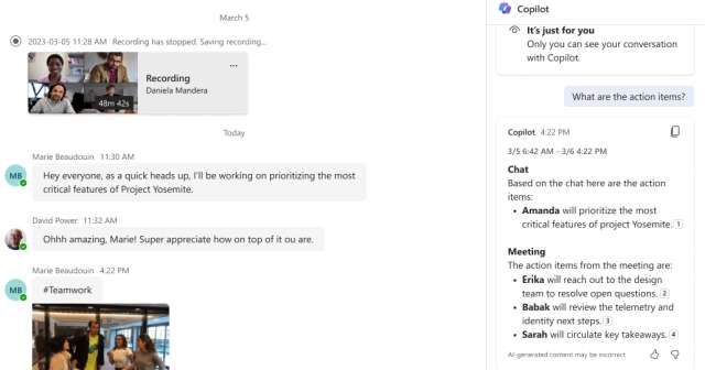 Copilot può essere già utilizzato per generare riassunti dei meeting. Entro il mese di maggio permetterà di ottenere informazioni più complete combinando le trascrizioni (quello che i partecipanti hanno detto) con le conversazioni (quello che i partecipanti hanno scritto).
