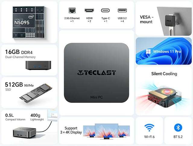 Il sistema operativo preinstallato è Windows 11 Pro con licenza Microsoft, ma volendo è possibile scegliere una distribuzione Linux. Come si legge nella descrizione completa, ecco le porte presenti sul case: quattro USB 3.2 Type-A, una Type-C, slot Ethernet, jack audio e uscite video HDMI per il collegamento di tre monitor con risoluzione fino al 4K. Le dimensioni sono pari a 11,7×11,7×4,1 centimetri, mentre il peso si attesta a 412 grammi.