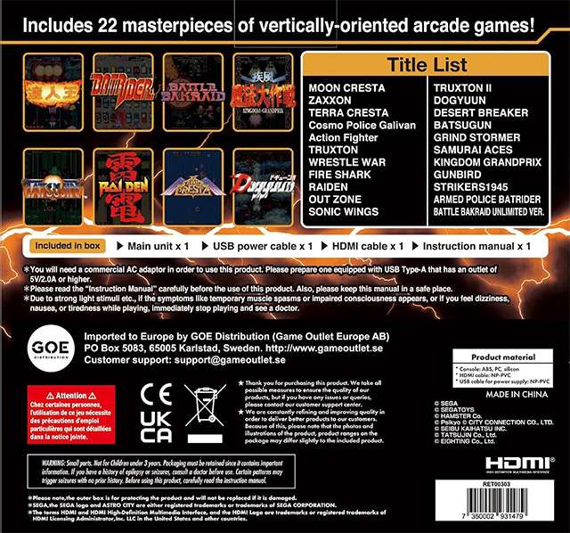 Ecco l’elenco completo dei 22 giochi preinstallati, tutti ottimizzati per lo schermo verticale: Truxton, Truxton II, Fire Shark, Outzone, Dogyuun, Batsugun, Grind Stormer, Moon Cresta, Zaxxon, Terra Cresta, Cosmo Police Galivan, Action Fighter, Wrestle War, Raiden, Sonic Wings, Desert Breaker, Samurai Aces, Kingdom Grand Prix, Gunbird, Strikers 1945, Armed Police Batrider, Battle Bakraid Unlimited.