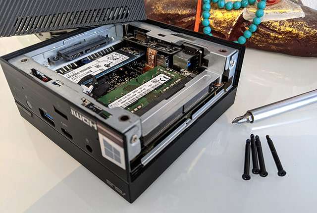 PN62 è piccolo, molto piccolo. Sta nel palmo di una mano. L’ingombro (115x115x49 millimetri) è di poco superiore a quello di un disco fisso esterno, eppure racchiude tutto ciò che serve per essere operativi a partire dal processore Intel Core i5-10210U di decima generazione affiancato da 8 GB di RAM e da un’unità SSD con capacità fino a 256 GB per lo storage. Non è sufficiente? Basta togliere le quattro viti nella parte inferiore, estrarre lo sportellino e si è liberi di aggiungere un disco o un banco di RAM.
