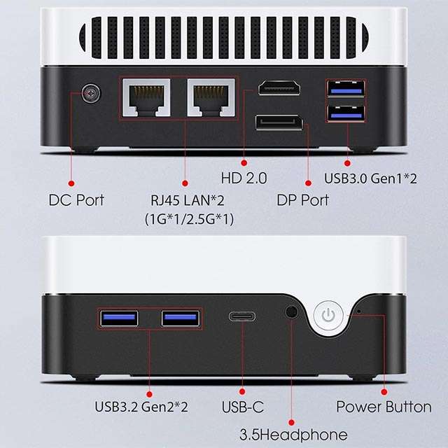 Il sistema operativo è Windows 11 con licenza ufficiale Microsoft. Queste le specifiche tecniche in dotazione: processore quad core Intel N100 con architettura Alder Lake, 12 GB di RAM LPDDR5, unità SSD da 512 GB per l’archiviazione dei dati, moduli Wi-Fi 6 e Bluetooth 5.2 per la connettività wireless, due slot Ethernet (1 Gigabit e 2,5 Gigabit), due porte USB 3.2 Gen 1 Type-A e altrettante USB 3.0 Gen 1 Type-A, una USB-C, jack audio, uscite video HDMI 2.0 e DisplayPort per la connessione simultanea a più monitor con supporto alla risoluzione 4K. Tutti gli altri dettagli sono riportati nella descrizione completa.
