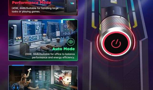 La presenza di una doppia ventola e l’illuminazione RGB regolabile in diverse modalità rendono il Mini PC ideale per i gamer. Dotato di Wi-Fi 6, Bluetooth 5.2 e porta LAN da 2,5 Gbps, offre una connettività veloce e stabile. La configurazione hardware include 16 GB di RAM DDR4 a doppio canale e un SSD NVME da 512 GB.