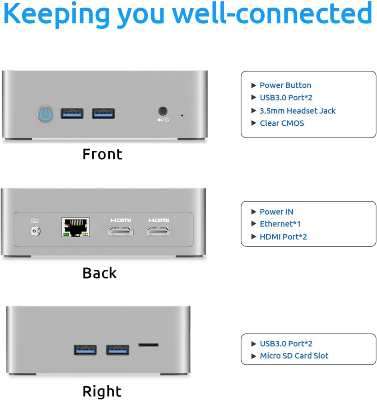 Il piccolo case lascia comunque spazio ad un’ampia varietà di porte tra USB 3.0, jack audio, lettore di schede microSD, RJ45 e HDMI. La connettività è invece garantita da moduli WiFi 2.4/5GHz e Bluetooth 5.0. Facile da installare e montare puoi posizionarlo anche sulla parte posteriore del monitor che usi.